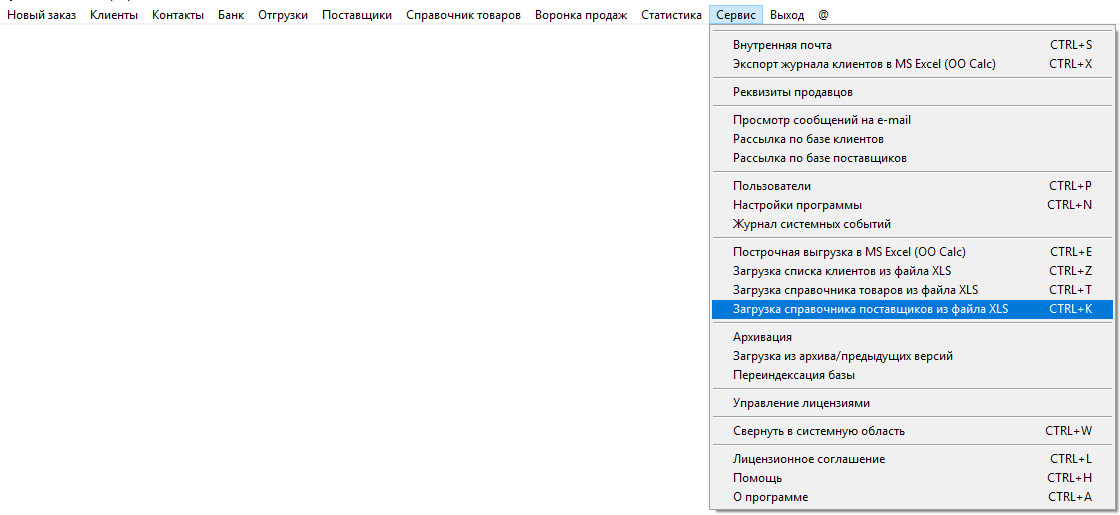 Затем запустите программу и выберите пункт меню "Сервис-Загрузка справочника поставщиков их файла XLS".