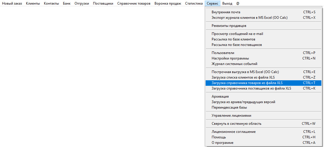 Затем запустите программу и выберите пункт меню "Сервис-Загрузка списка клиентов их файла XLS".