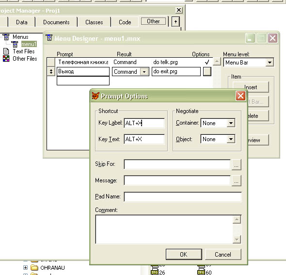 Обязательно около каждого пункта меню нажмите на квадратик в столбце Options и в открывшемся окне Prompt Options поставьте курсор на поле Key Label и установите сочетание клавиш для пункта меню (Для "Телефонная книжка" нажмите ALT-T, для "Выход" ALT-X). Нажмите кнопку OK. (рис 6.2)