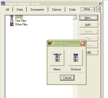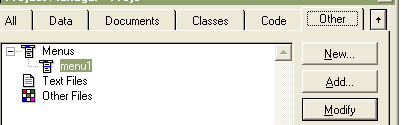 Установите курсор на кнопку Menus и нажмите кнопку New. В появившемся окне нажмите на кнопку с подписью "Menu" (рис 6.1). В результате откроется Menu Designer (рис 6.2)