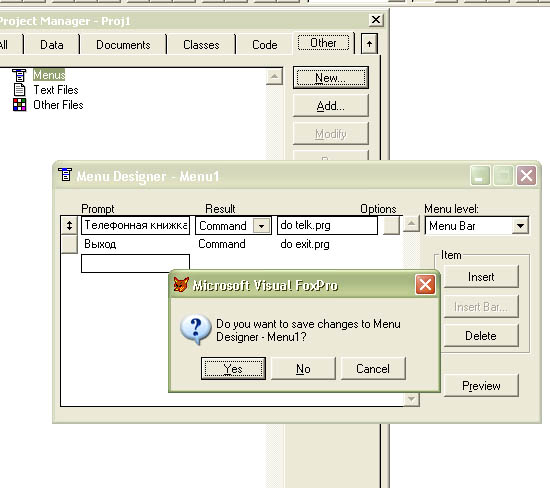 меню завершено, при закрытии Menu Designer будет предложено