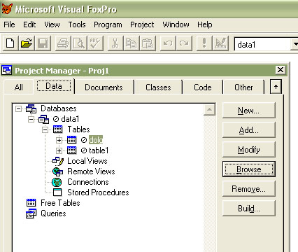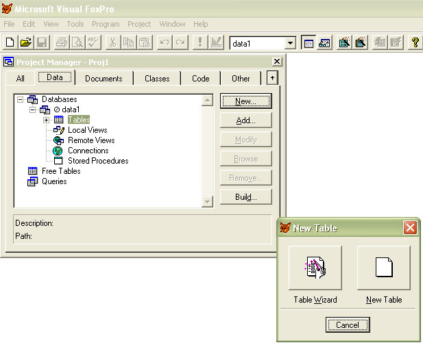Для Fox Pro 9 выберите таблицу Table1 в Project Manager, нажмите кнопку Browse, в меню появится раздел Table. Выберите пункт меню Append New Record