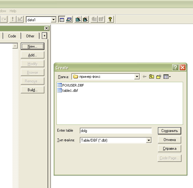 Затем в открывшейся форме нажимаем кнопку New Table, задаем имя файла dolg и нажимаем кнопку "Сохранить"(рис 8.21).