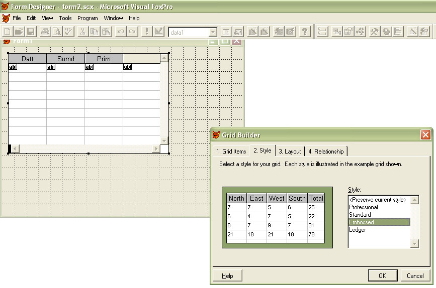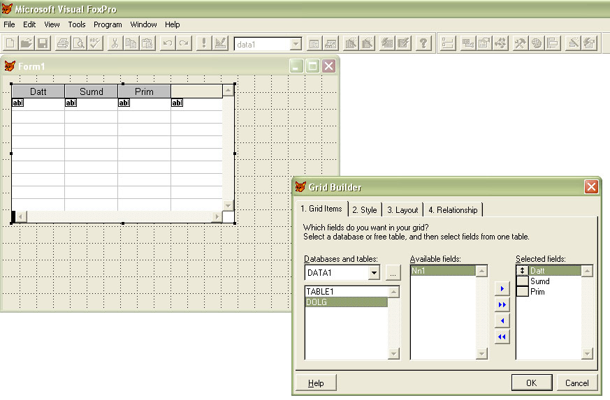 В окне Grid Builder в закладке Grid Items в окошке Databases and tables выберем нашу таблицу DOLG. (рис 8.30)