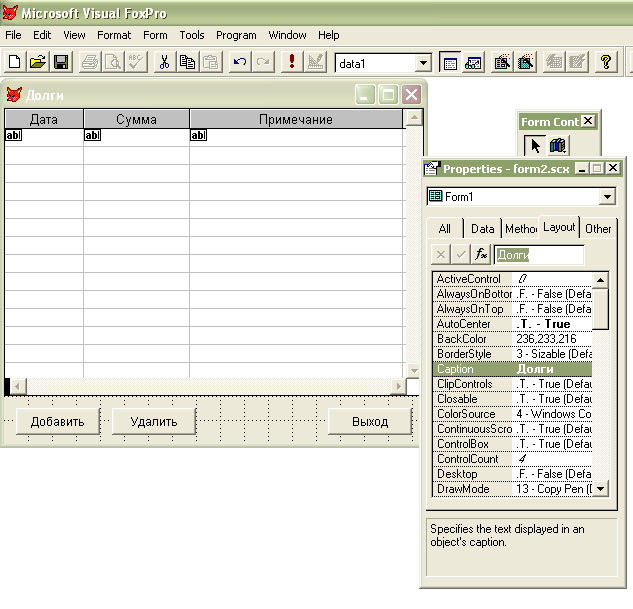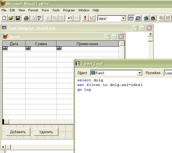 Теперь временно закроем форму с долгами, предварительно ее сохранив (либо автоматически при закрытии формы, меню File - Save ).