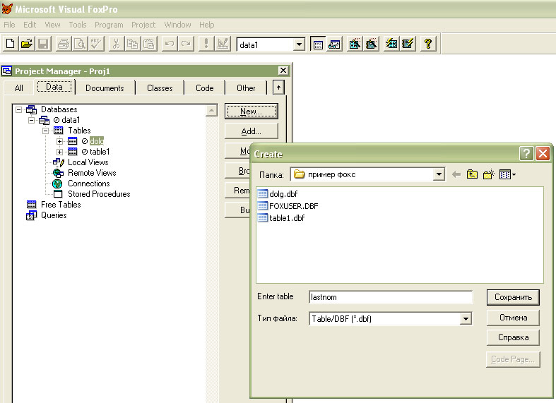 Затем в открывшейся форме нажимаем кнопку New Table, задаем имя файла lastnom и нажимаем кнопку "Сохранить"(рис 8.39).