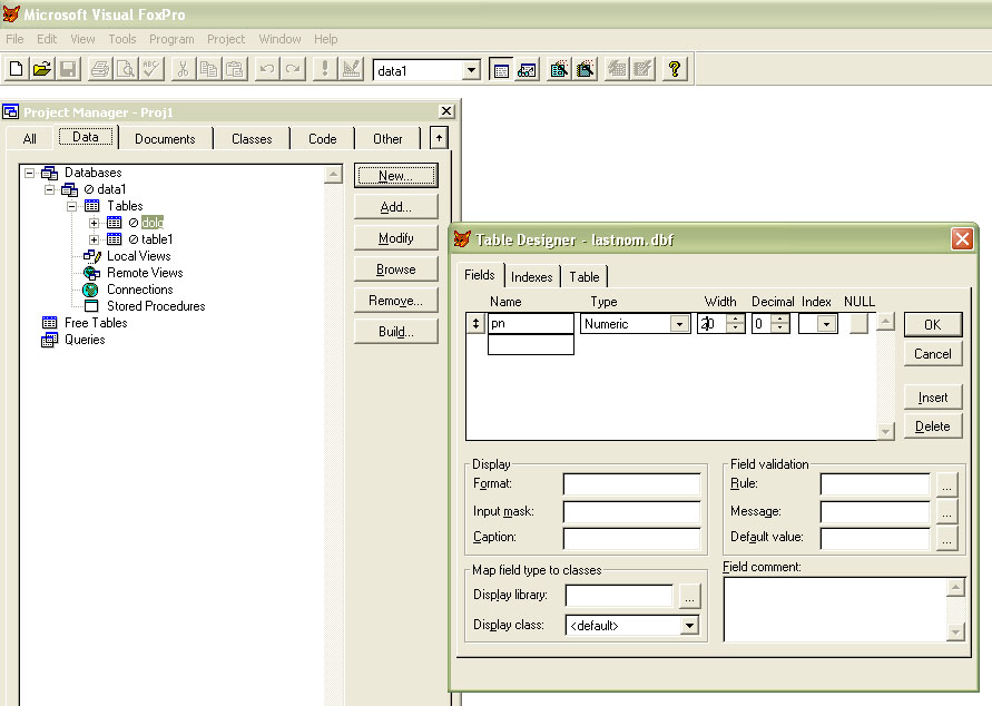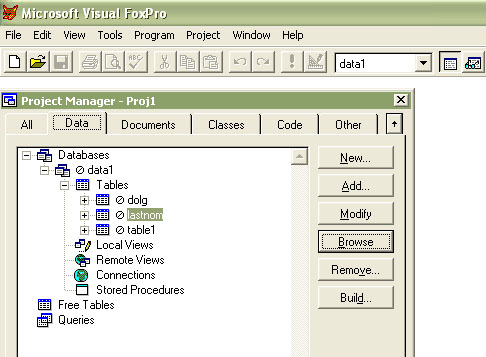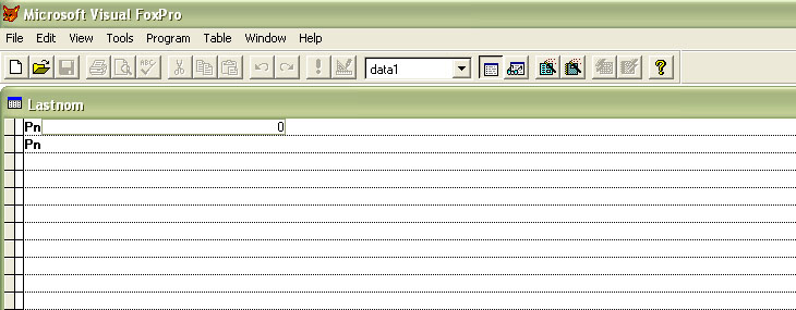 Для Fox Pro 9 выберите таблицу lastnom в Project Manager, нажмите кнопку Browse, в меню появится раздел Table. Выберите пункт меню Append New Record