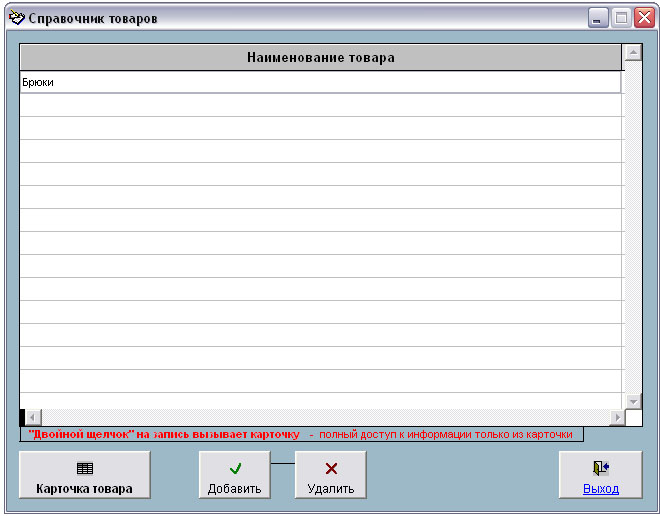 При выборе пункта меню "Справочник товаров" загрузится одноимённое окно (рис. 3.1). |