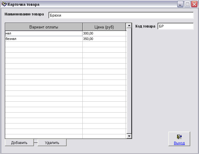 товара. Кнопки Добавить и Удалить используются для добавления и удаления товаров. При нажатии на кнопку "Добавить" создается новый товар и открывается "Карточка товара", куда заносится информация о товаре/услуге. Все реквизиты обязательны для заполнения. Артикул товара = Код товара+Вариант оплаты проставляется в карточке клиента при вводе заказа. |