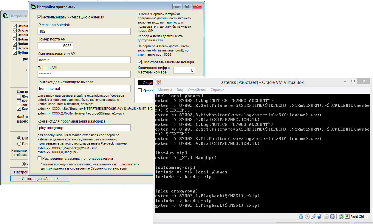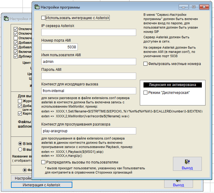 На скриншоте представлен пример настроек для интеграции с Asterisk.