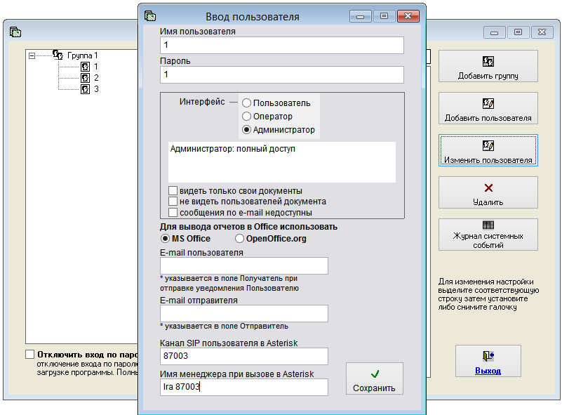 После того, как будут введены настройки, нужно зайти в меню Сервис-Пользователи, зайти в карточки пользователей и ввести внизу нужные номера каналов SIP, вход по паролю должен быть включен.