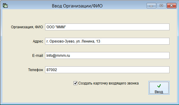 При нажатии кнопки "Создать карточку" сначала открывается карточка для ввода информации о звонящем, затем, при нажатии кнопки "Ввод" эта информация добавляется в справочник Сторонних Организаций/ФИО (меню Сервис-Сторонние организации).