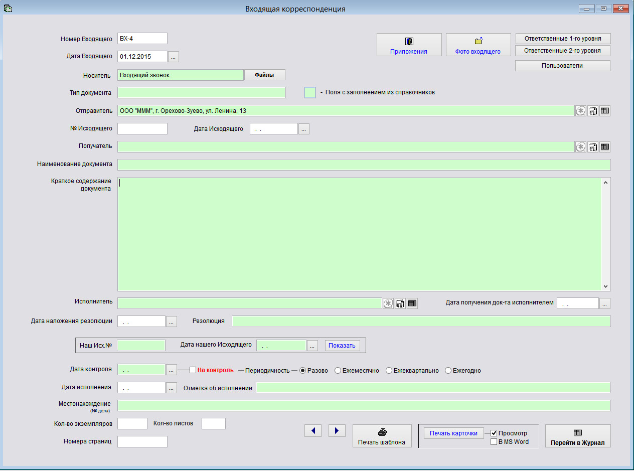 В программе "Регистрация документов организации" реализованы следующие функции: