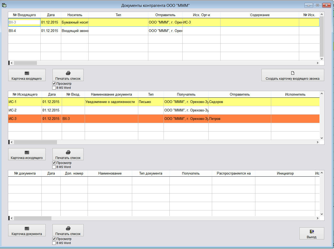 В данном разделе можно открыть карточки документов контрагента/сотрудника, распечатать списки документов.