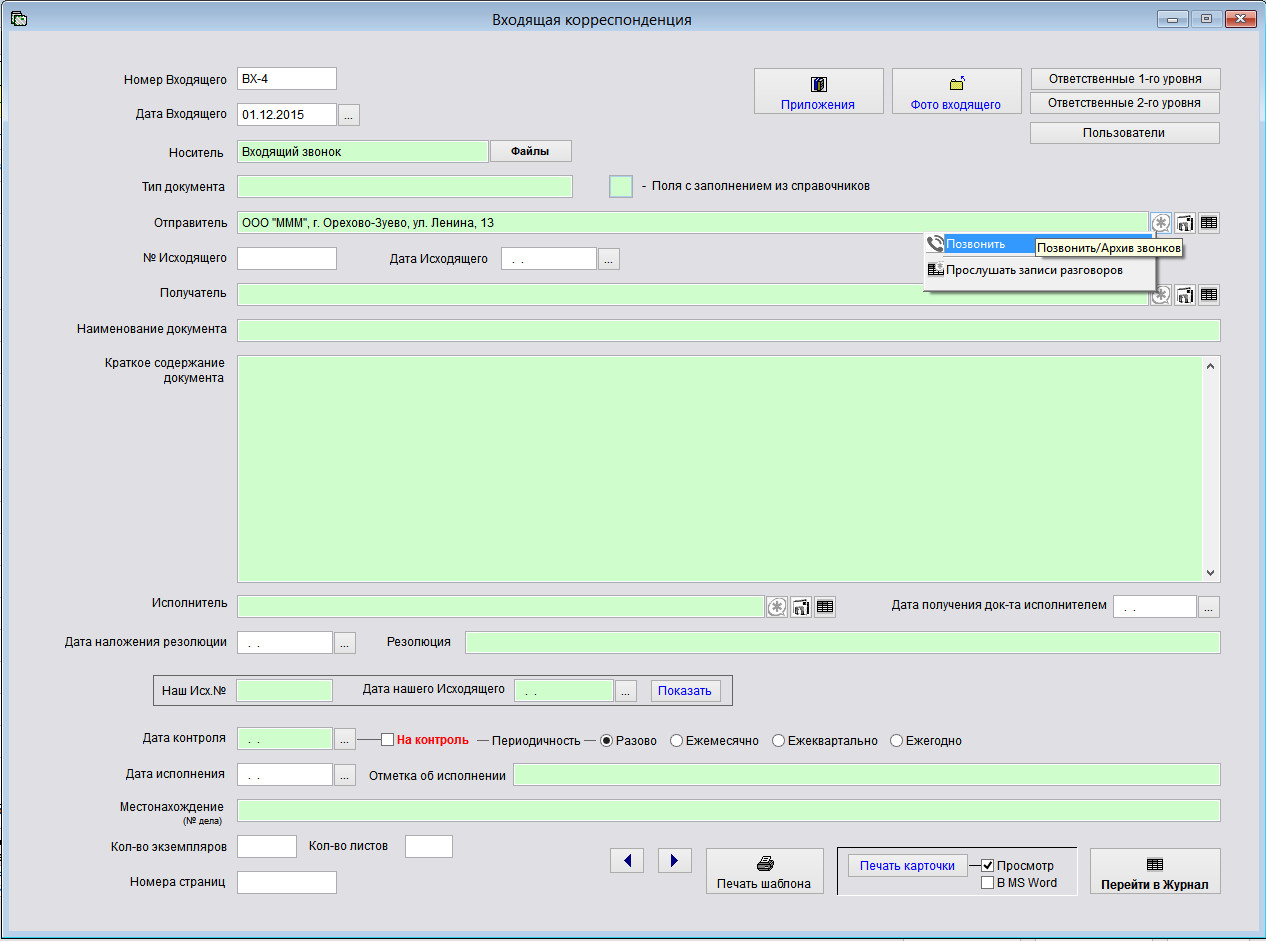 Если требуется, можно нажать кнопку "Создать карточку входящего документа", будет создана карточка входящего документа с заполненным полем "Носитель" (значением "Входящий звонок") и полем "Отправитель" (названием/ФИО звонящего).