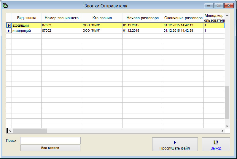 - ведение журнала телефонных разговоров, поиск по журналу и возможность прослушать разговоры менеджеров (если в Asterisk в используемый контекст включена функция MixMonitor для записи разговоров)