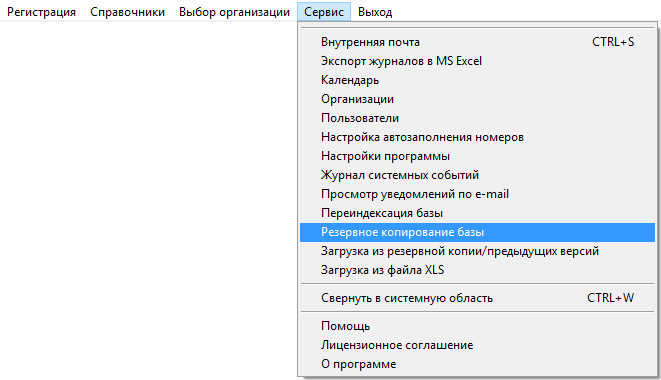 Для создания резервной копии в программе "Регистрация документов организации" выберите раздел меню "Сервис-Резервное копирование базы".