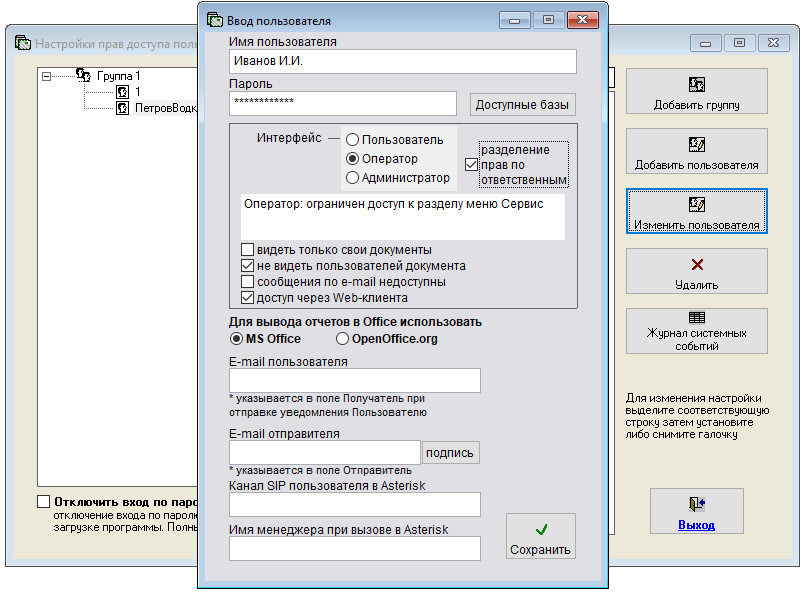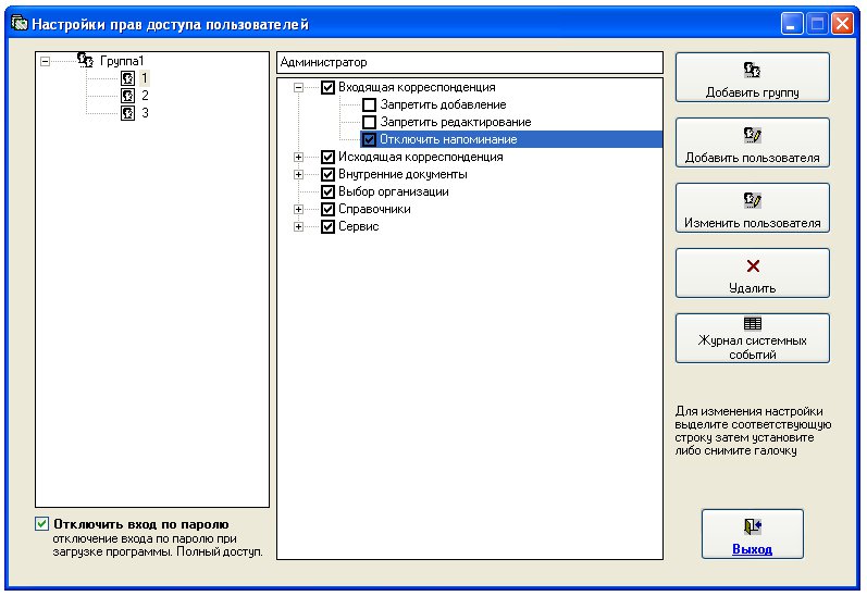 В случае, если включен вход по паролю в программу (галочка "Отключить вход по паролю" в "Настройках прав доступа пользователей" снята), напоминание можно отключить для выбранных пользователей программы с интерфейсом "Оператор" или "Администратор".