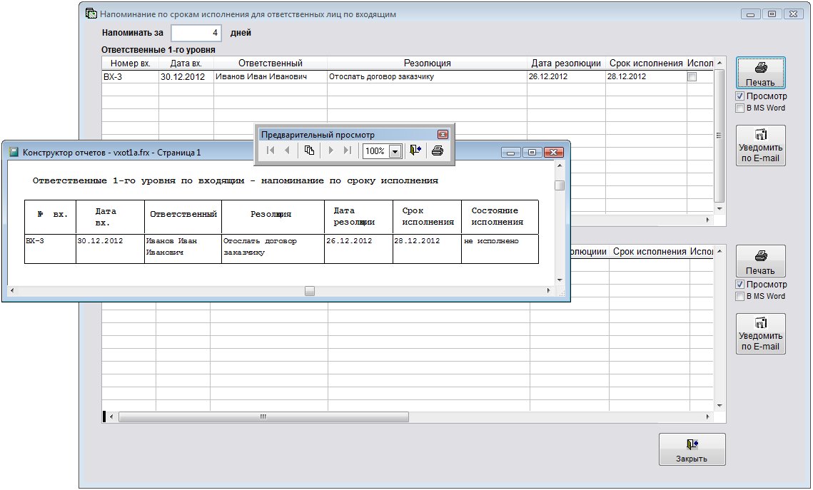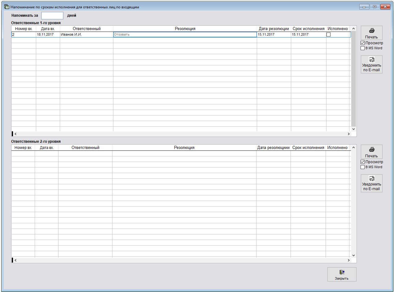 В оповещение попадут записи из разделов Ответственных 1-го и 2-го уровней, для которых текущая дата станет больше либо равна Дате контроля минус заданное количество дней и не будет установлена галочка "Исполнено".