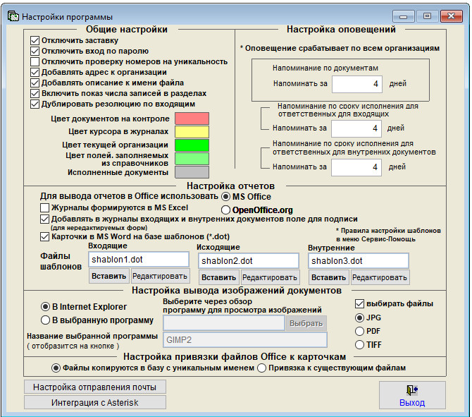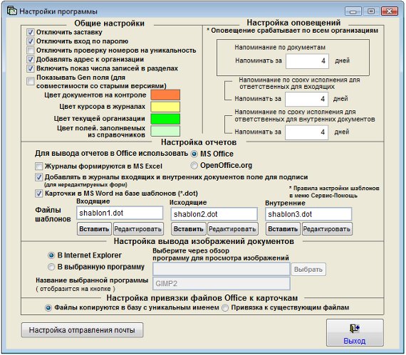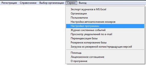 Для задания количества дней, за которое до текущей даты срабатывает оповещение по Ответственным 1-го и 2-го уровня выберите пункт меню "Сервис-Настройки программы".