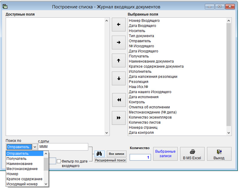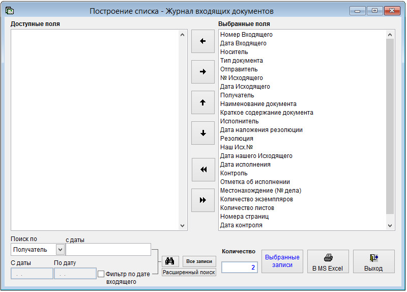 В окне настройки выберите те поля карточки входящего, которые требуется экспортировать в MS Excel (OO Calc).