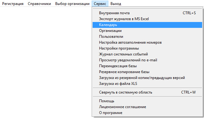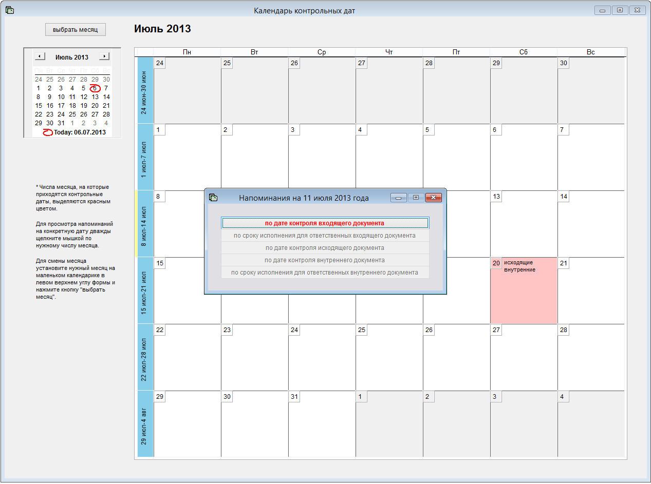 Для просмотра напоминаний по контрольным датам в виде календаря в программе "Регистрация документов организации" выберите раздел меню "Сервис-Календарь".