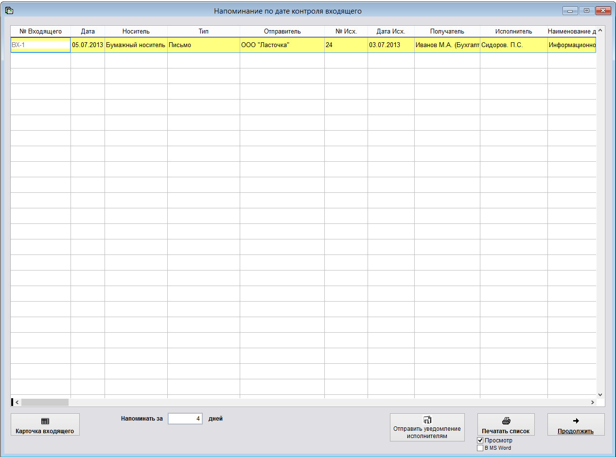 Из открытого раздела можно распечатать список документов с контрольной датой на выбранный день, для напоминаний по датам контроля для входящих, исходящих и внутренних документов можно просмотреть карточки документов и отправить уведомление на e-mail для исполнителей данных документов.