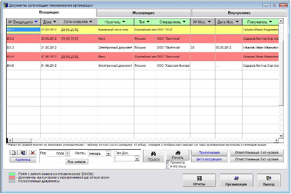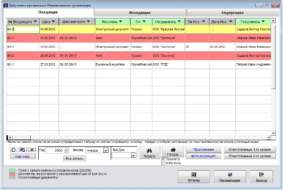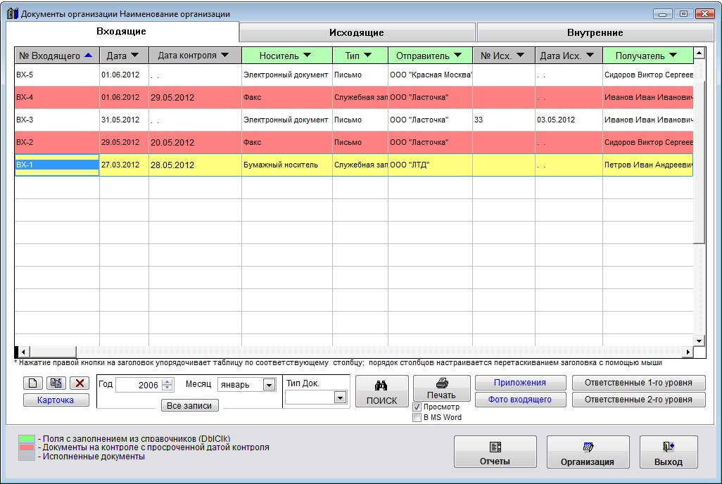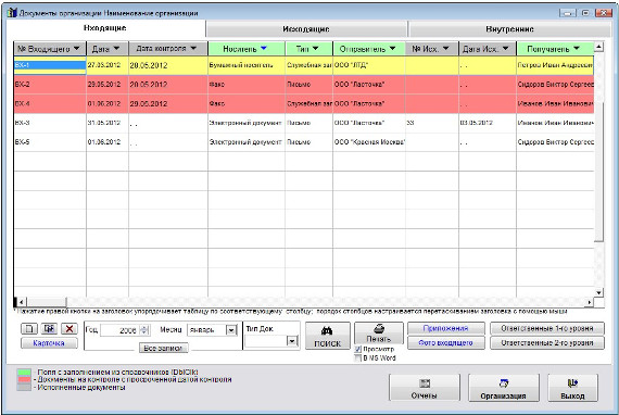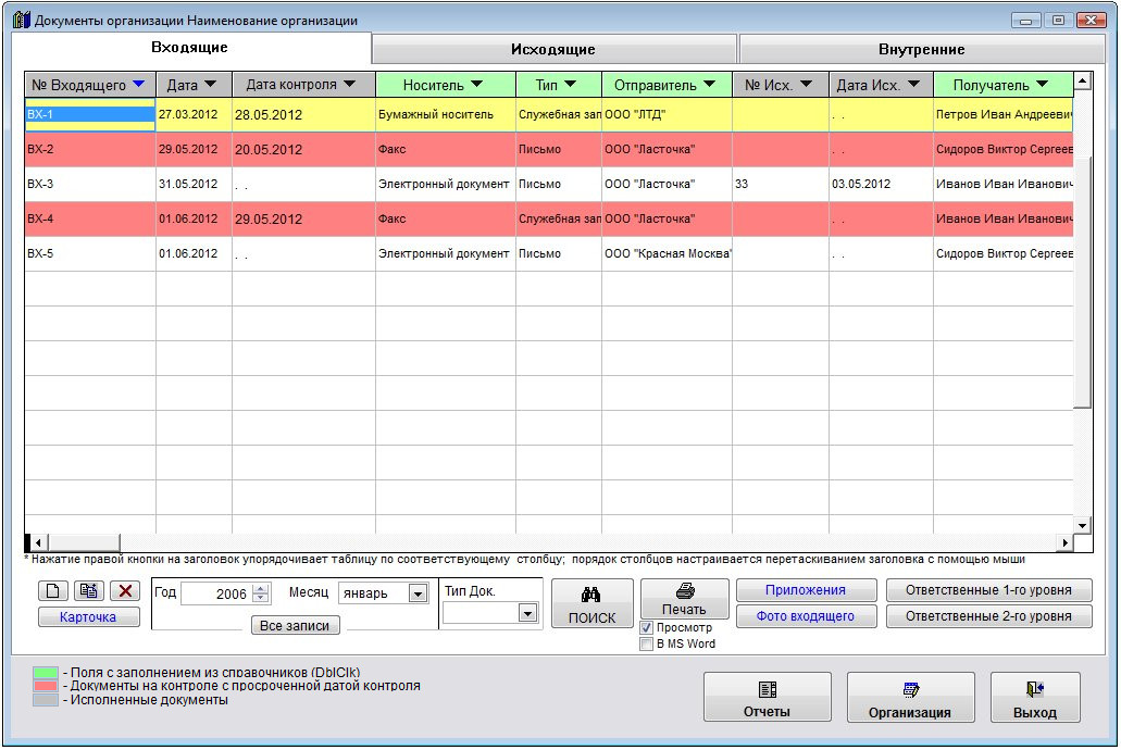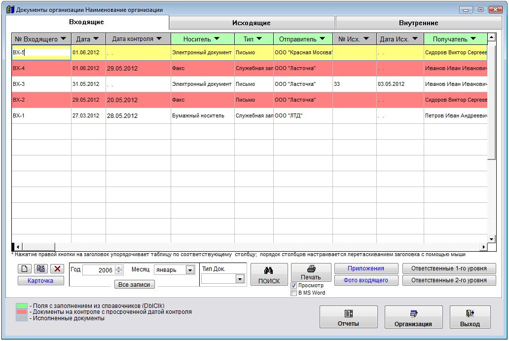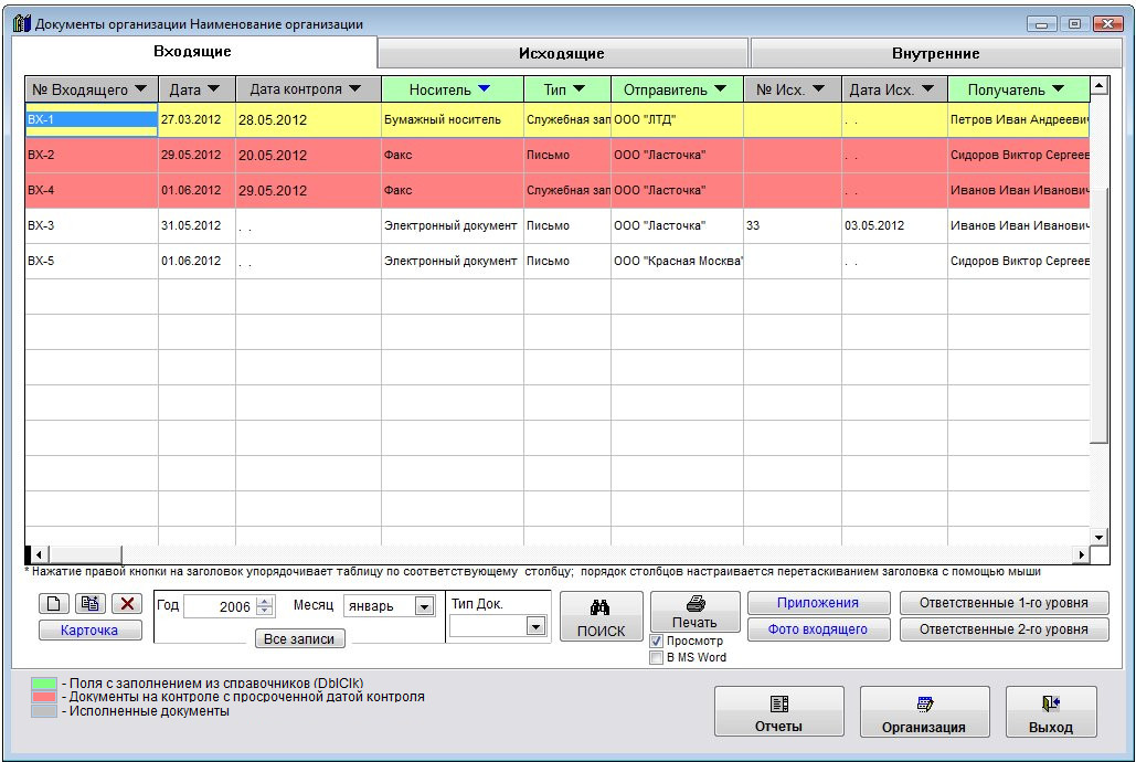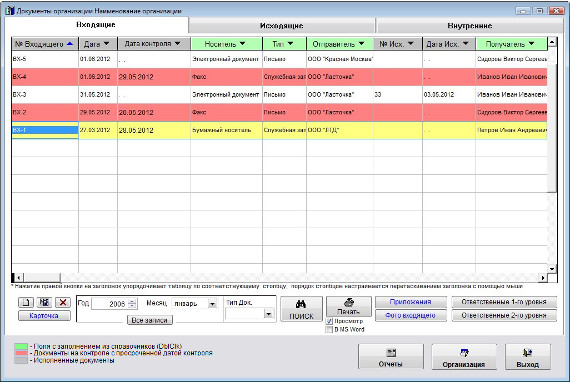 Аналогичным образом можно упорядочить записи по любому столбцу в журналах входящих, исходящих и внутренних документов.