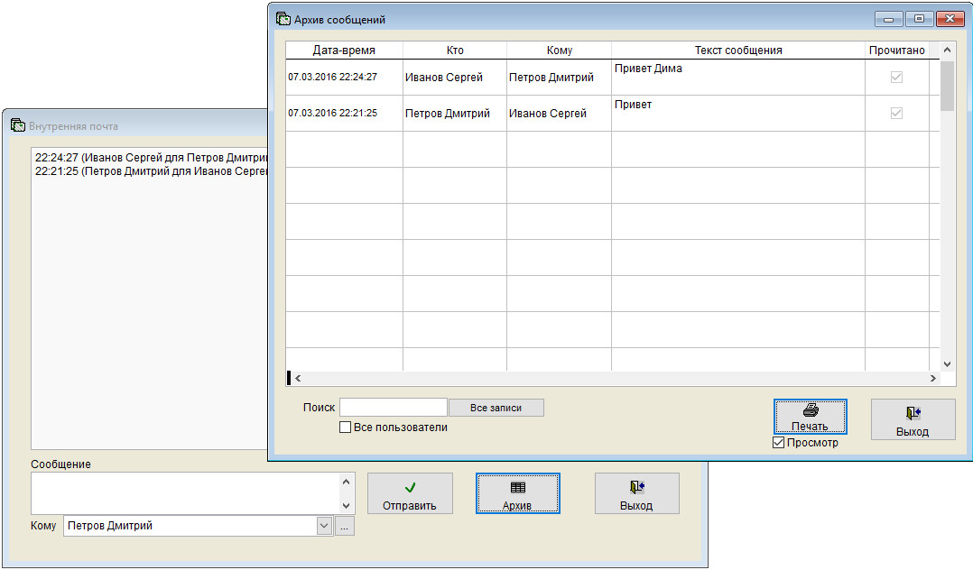 В программе "Регистрация документов организации" есть возможность для пользователей программы отправлять друг другу сообщения с использованием внутренней почты.