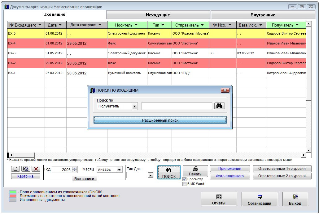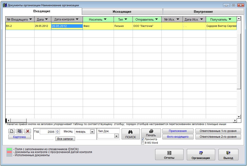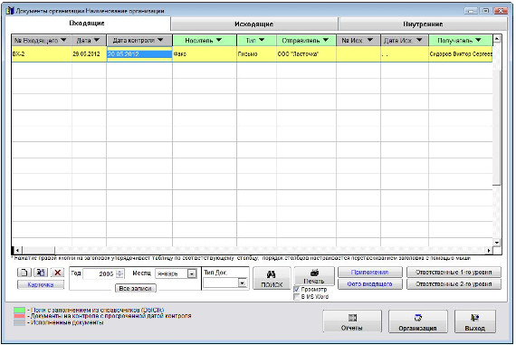 В журнале входящих отобразятся только те записи, которые соответствуют критериям поиска, т.е. все документы на бумажном носителе с датой входящего, попадающего в указанный интервал дат.