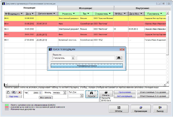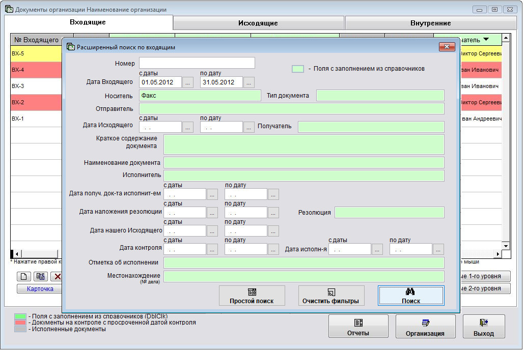В окне расширенного поиска введите критерии поиска, например интервал дат, за который надо увидеть документы и любые другие параметры (в нашем случае Носитель).
