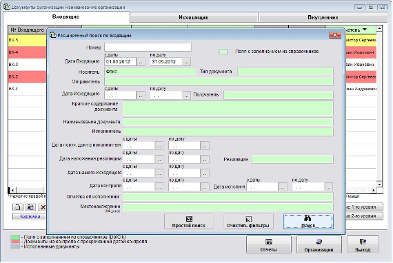 Параметры учитываются при поиске по условию И, т.е. в нашем случае отобразятся все документы на бумажном носителе с датой входящего, попадающего в указанный интервал дат.