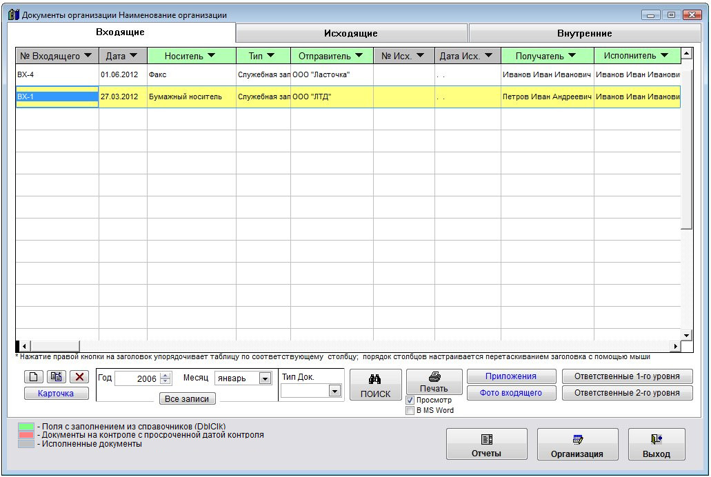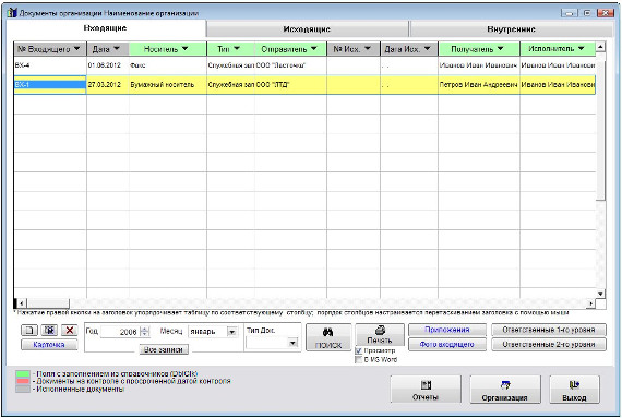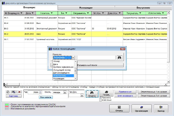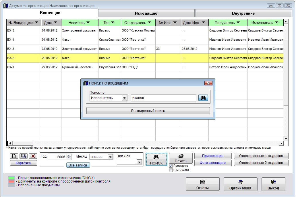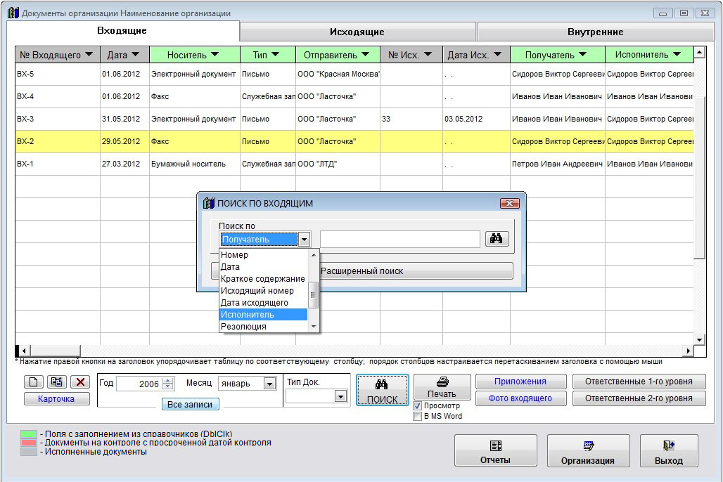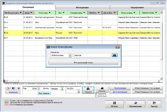 В журнале входящих отобразятся только те записи, которые соответствуют критерию поиска, т.е. где исполнитель содержит введенный критерий поиска.