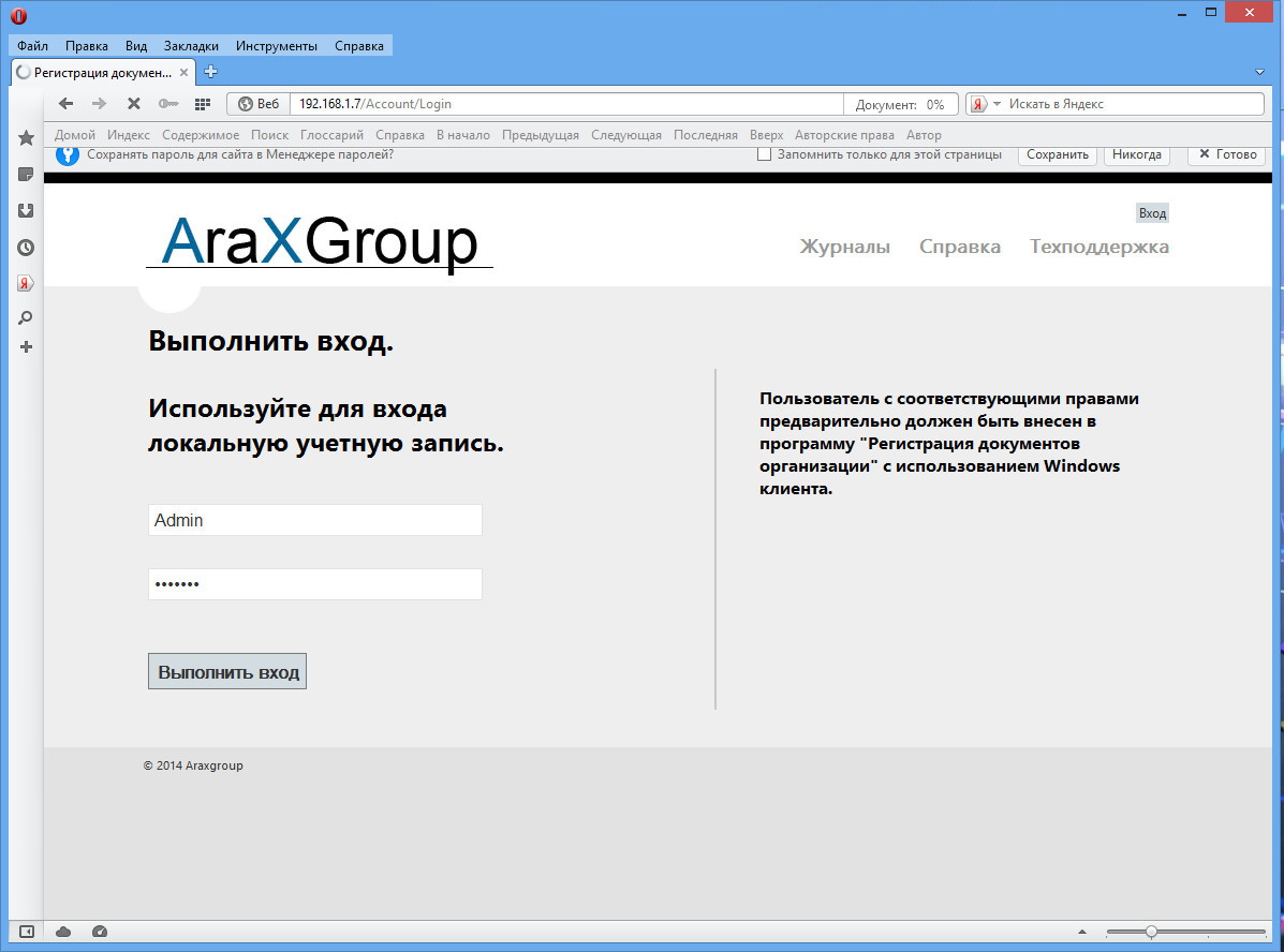 Введите имя и пароль пользователя и нажмите кнопку "Выполнить вход".