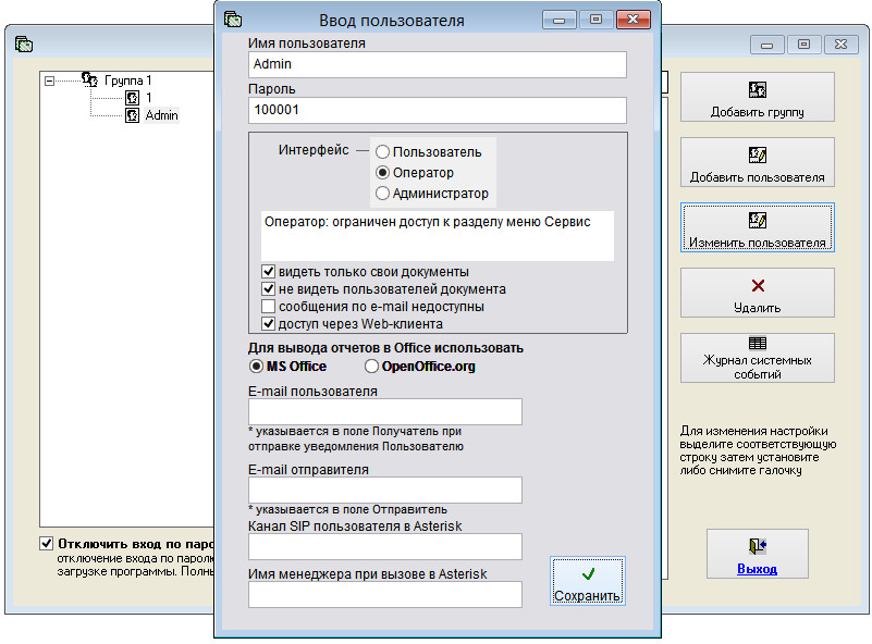 Пользователь предварительно должен быть введен в Windows версии программы в разделе меню Сервис-Пользователи.