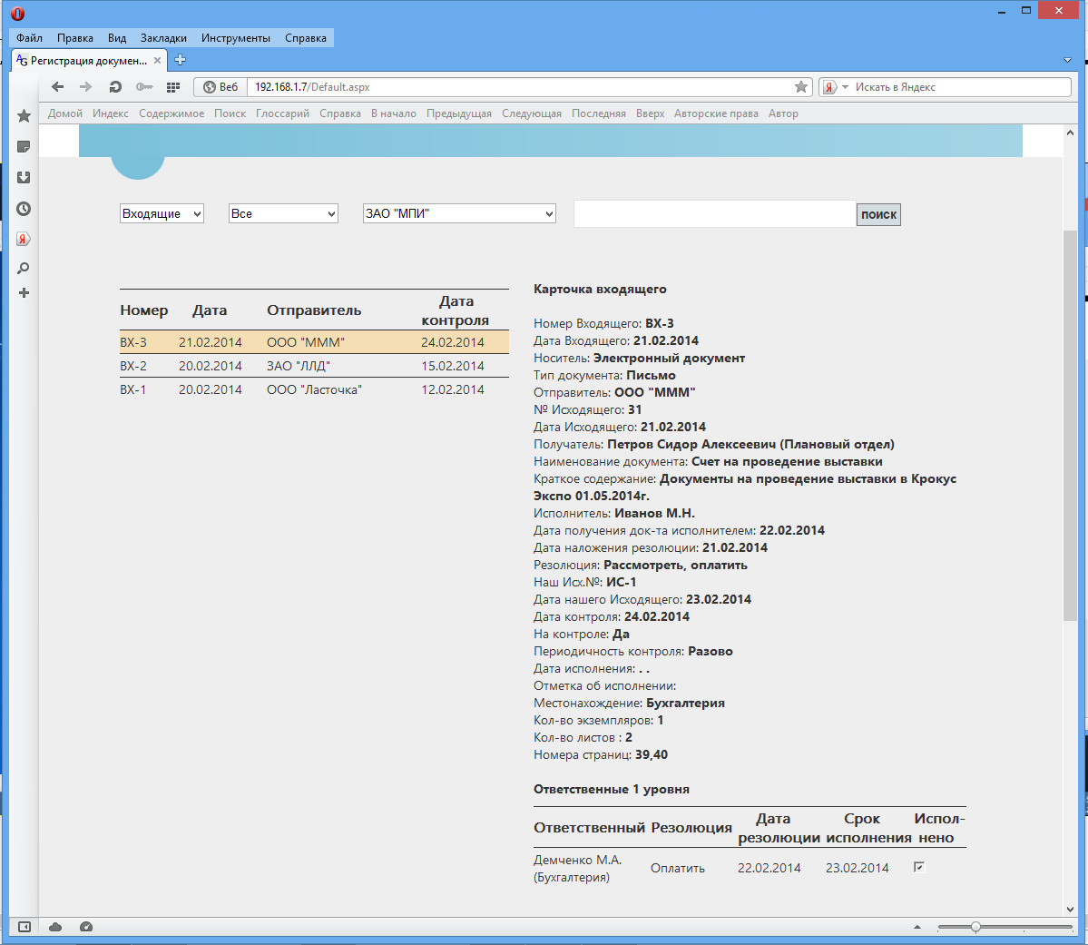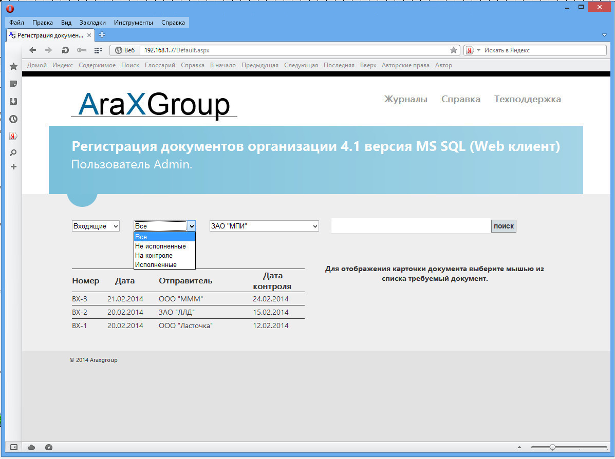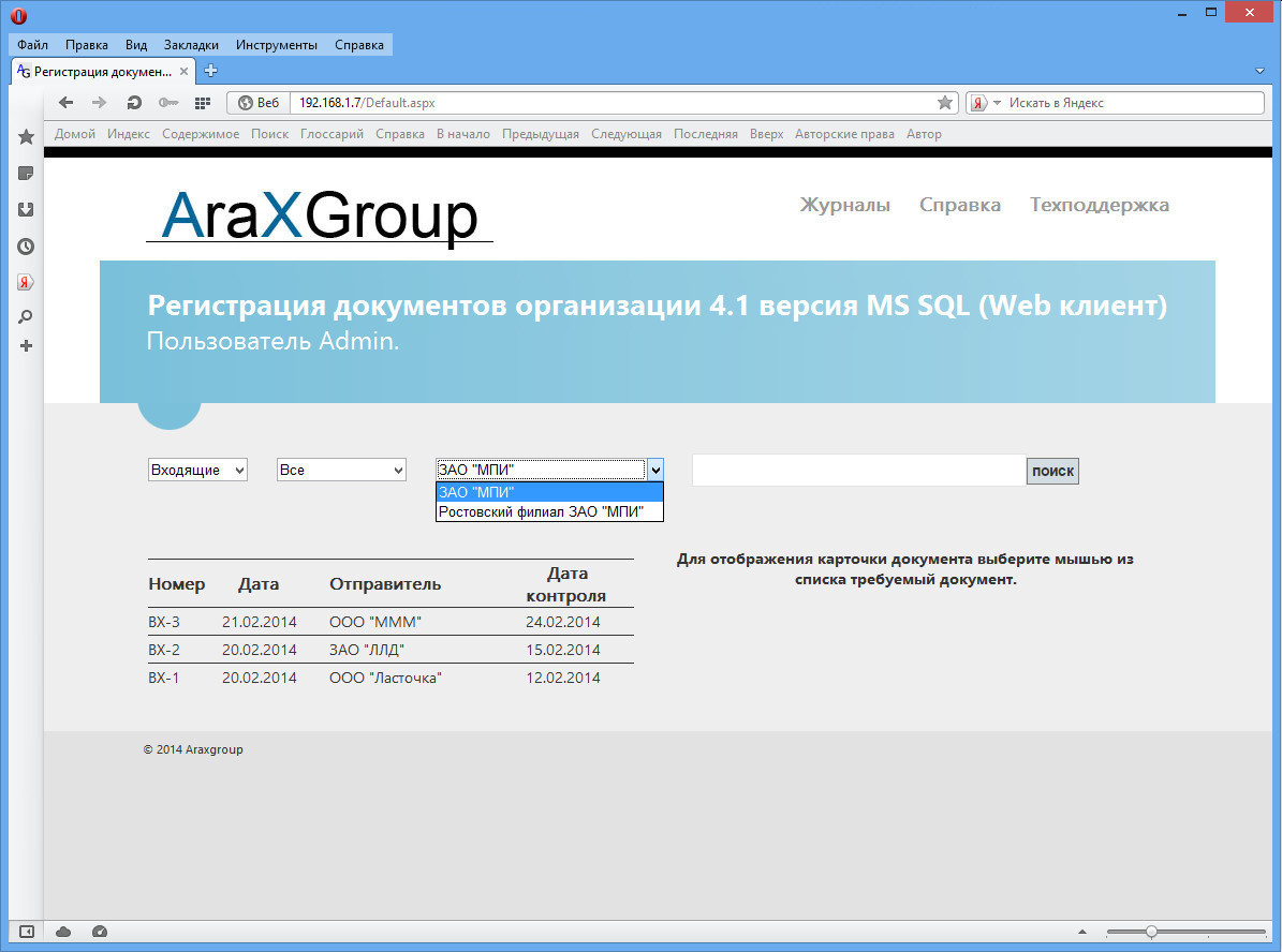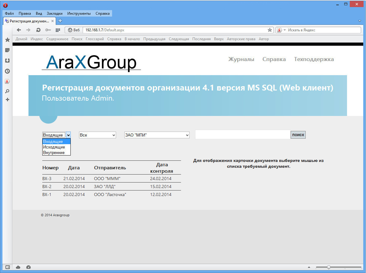 Для просмотра журнала входящих, исходящих или внутренних документов выберите в левом ниспадающем списке соответствующий журнал: "Входящие", "Исходящие" или "Внутренние".