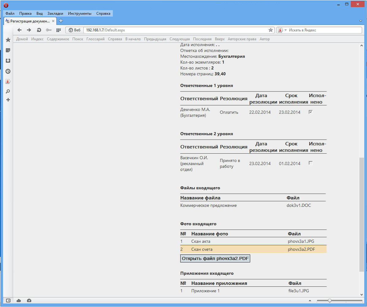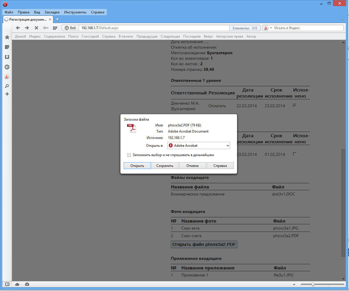 Для просмотра прикрепленных файлов в разделах Файлы, Фото или Приложения выберите мышью нужный файл из списка, в нижней правой части экрана, после чего станет доступна кнопка для открытия либо сохранения соответствующего файла.