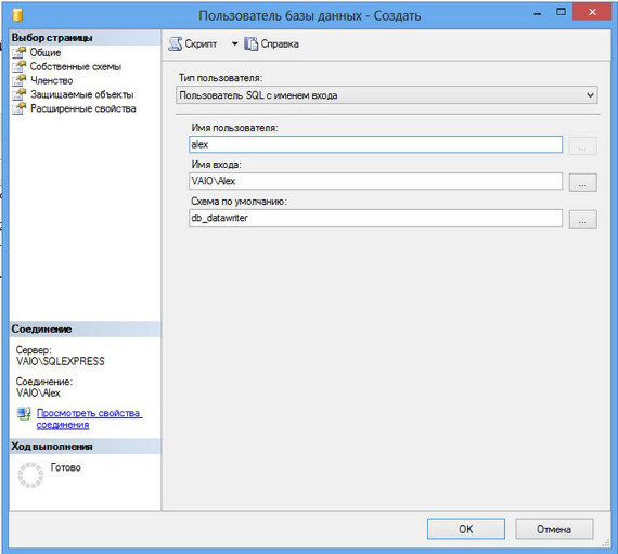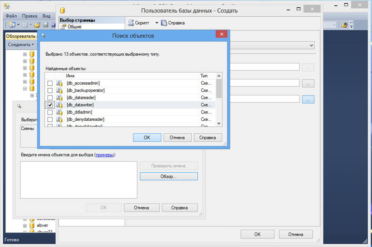 Затем выберите, к какому пользователю Windows он привязывается, и в третьем поле выбираете схему db_datawriter и db_datareader.