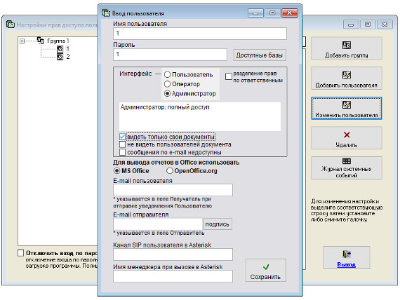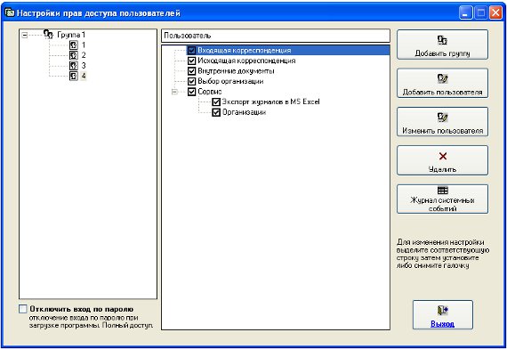 При отключенной галочке "Отключить вход по паролю" при входе в программу станет появляться окно контроля доступа пользователей.