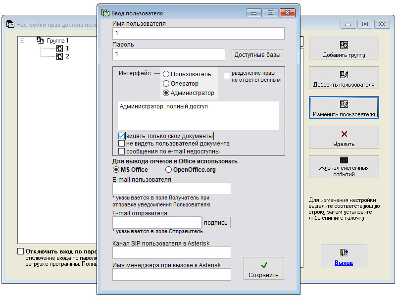 При входе в программу пользователь будет иметь те права доступа, которые были заданы при создании/изменении профиля данного пользователя.