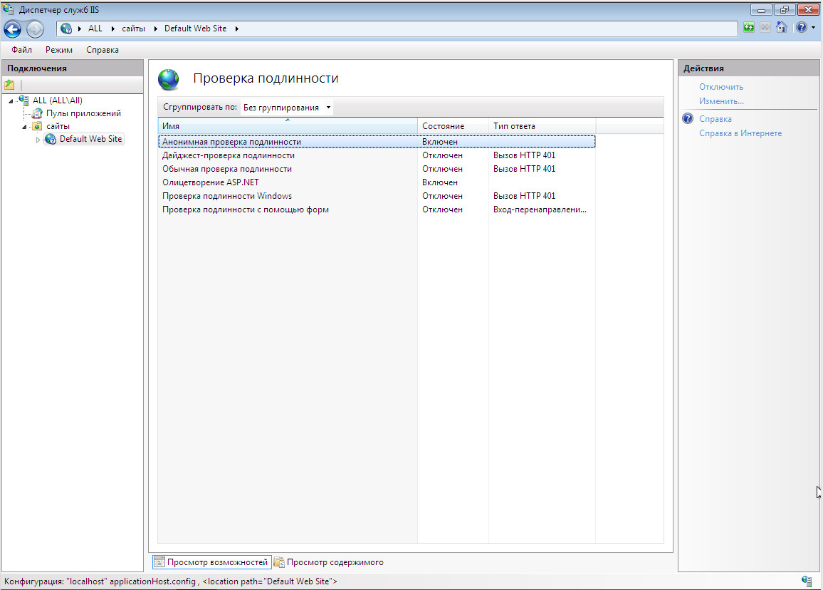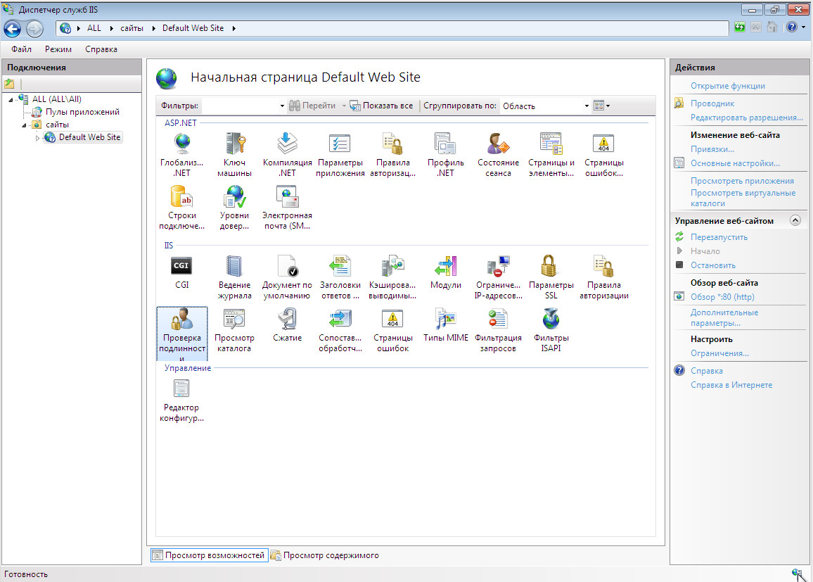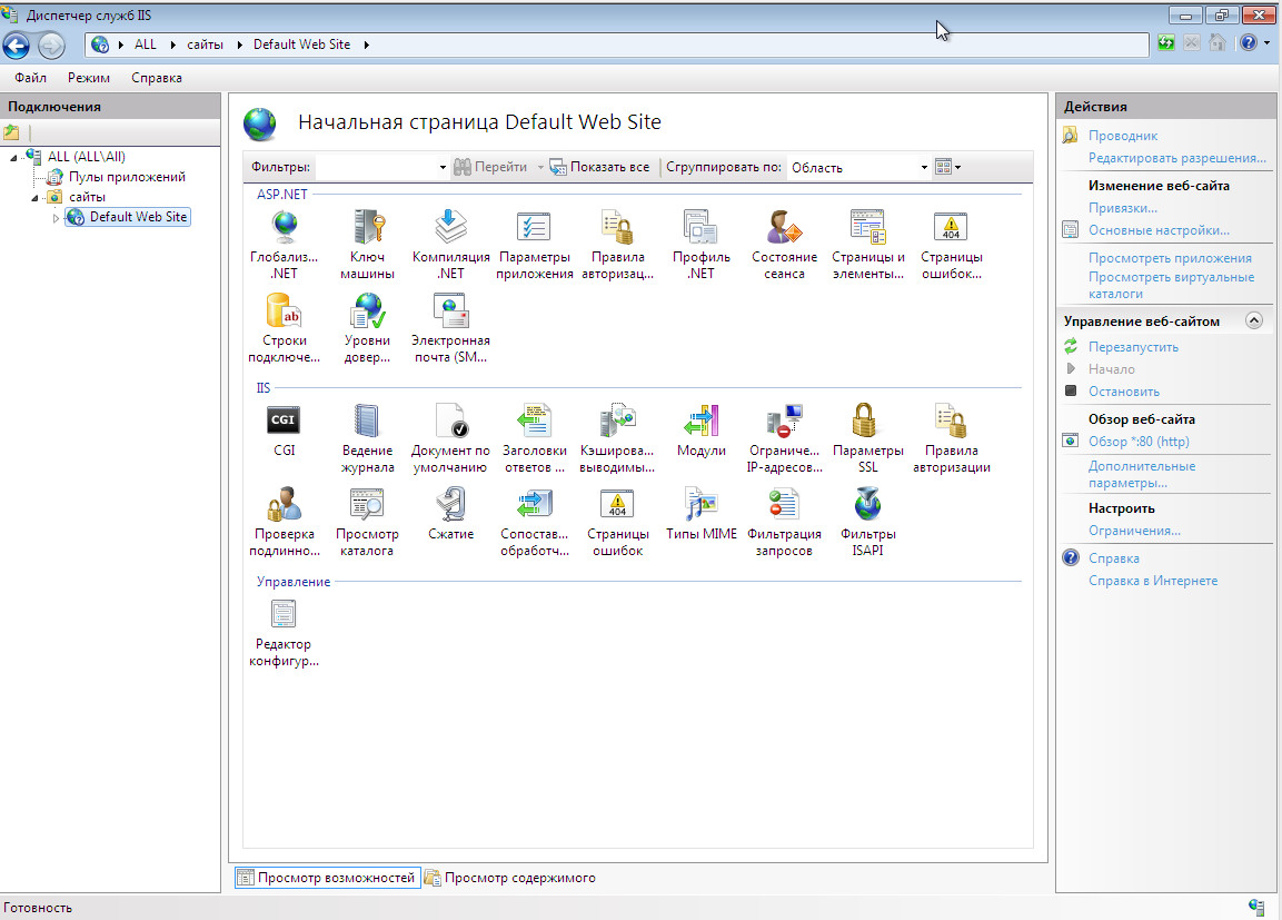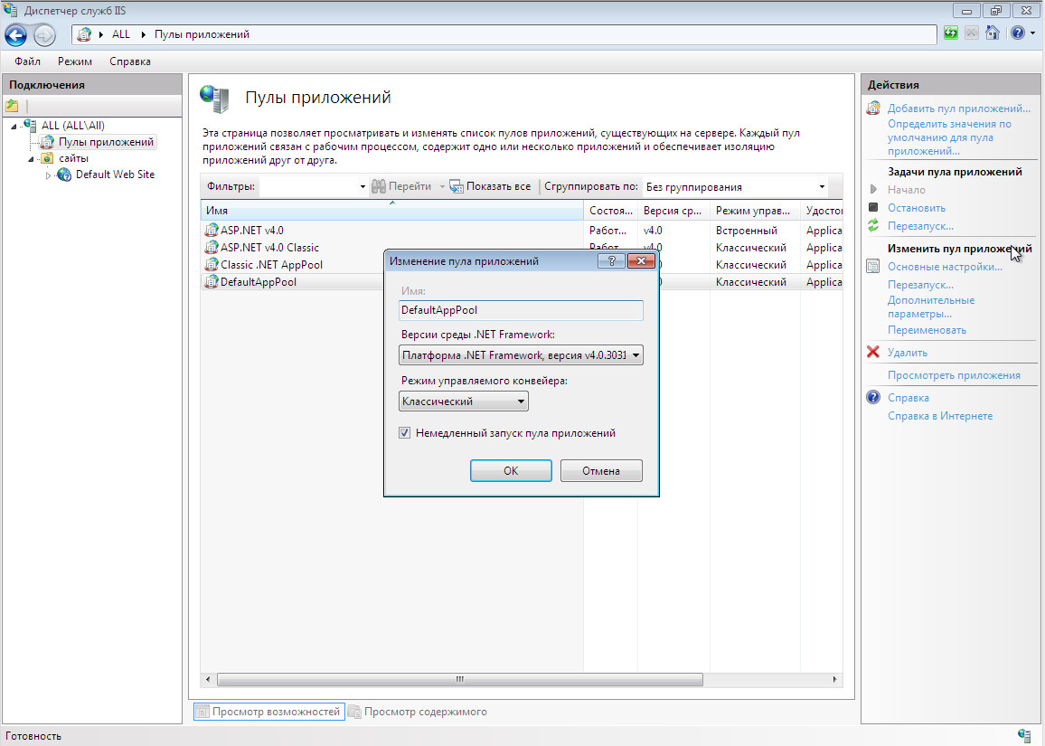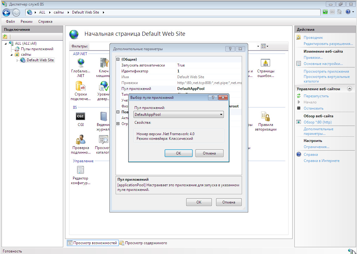 В правой части экрана выберите "Дополнительные параметры"и в открывшемся окне выберите пул приложений DefaultAppPool, и нажмите 2 раза ОК.