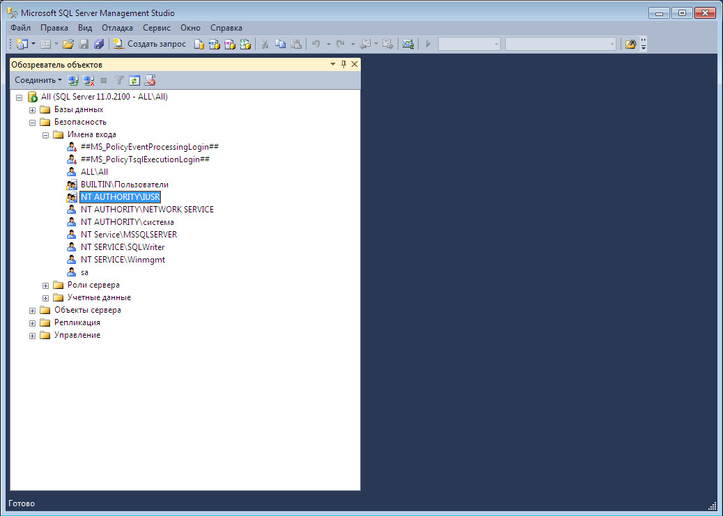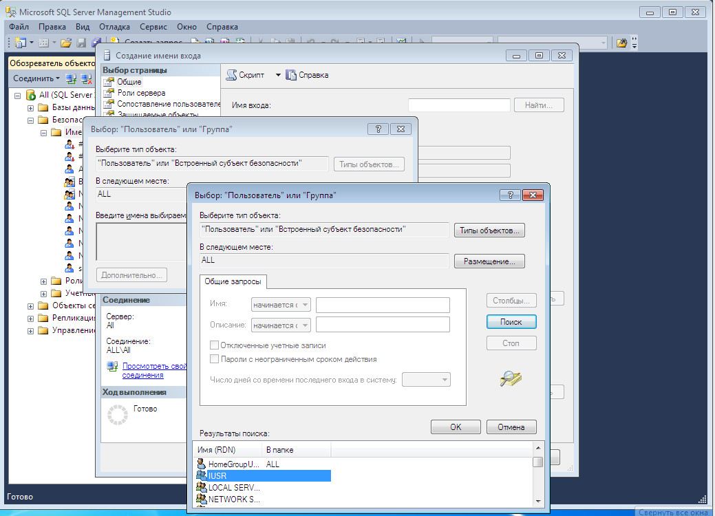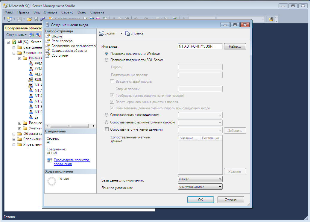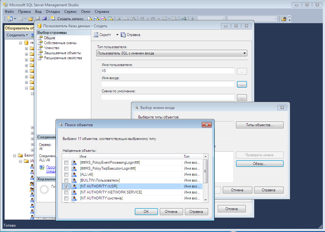 Пользователь IUSR (NT AUTHORITY\IUSR) будет добавлен в Имена входа.