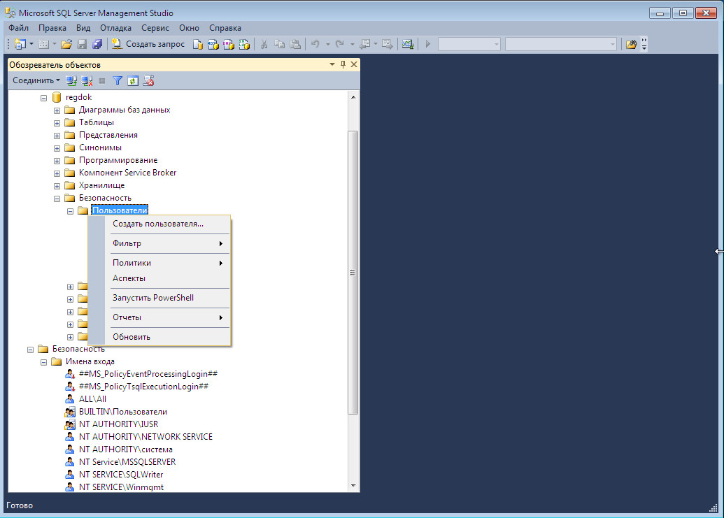 Затем раскройте нужную базу данных, которую использует программа Регистрация документов организации и в разделе Безопасность-Пользователи нажмите правой кнопкой мыши на "Пользователи" и выберите опцию "Создать пользователя".