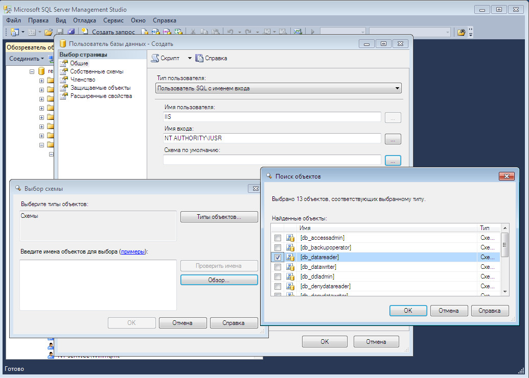 Затем для поля Схема по умолчанию аналогичным образом выберите схему db_datareader.