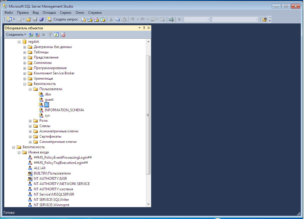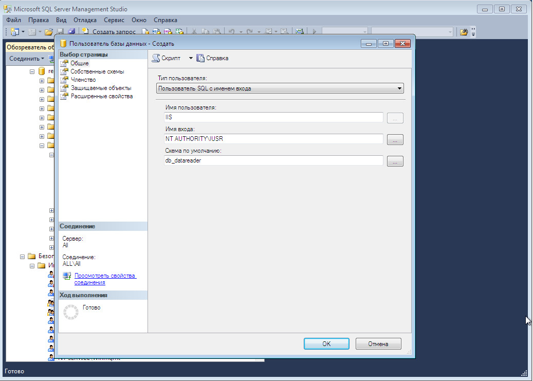 Далее необходимо разрешить доступ IIS к базе MS SQL Server.