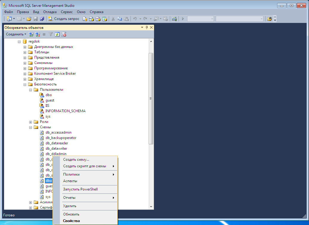 Затем раскройте раздел Безопасность-Схемы, на схему dbo нажмите правой кнопкой мыши и выберите опцию Свойства.