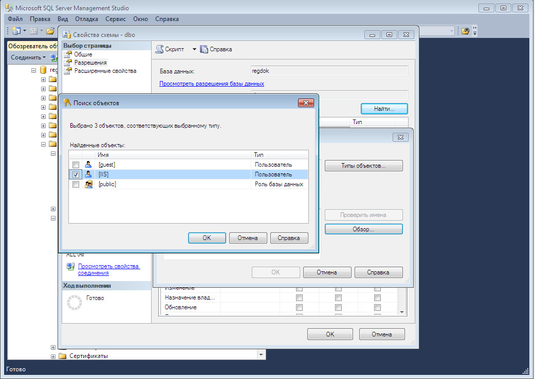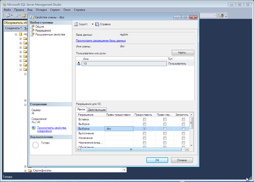 Затем для данного пользователя (IIS) установите галочку с столбце "Предоставить" в строках "Выборка", "Вставка", "Выполнение", "Изменение", "Обновление", предоставив ему права для соответствующих действий и нажмите ОК.