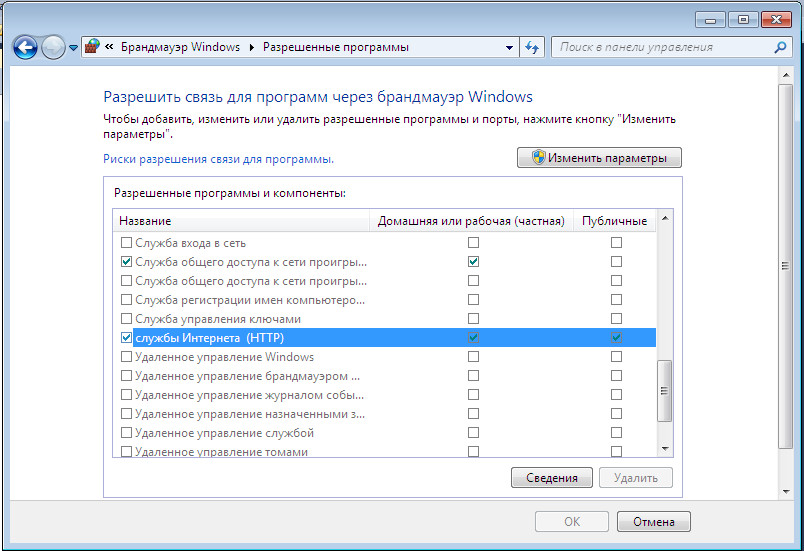 В панели управления - Система и Безопасность в брандмауэре Windows (разрешение запуска программ через брандмауэр Windows) включить входящие HTTP вызовы (опция "Службы Интернета (HTTP)"появляются при установленном IIS).