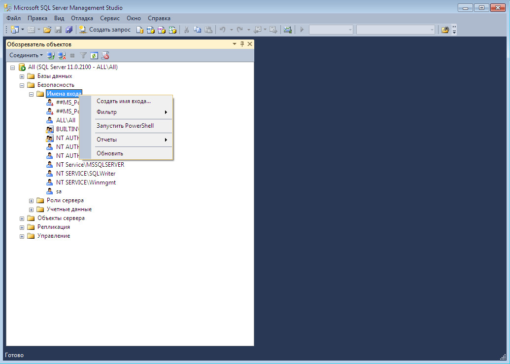 для экземпляра SQL Server в разделе Безопасность-Имена входа нажмите правой кнопкой мыши на "Имена входа" и выберите опцию "Создать имя входа".