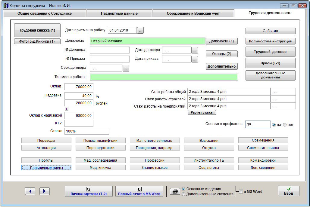 Если установлена опция "Для данного сотрудника", то в MS Word (OO Writer) , будет выведена информация только по данному сотруднику.